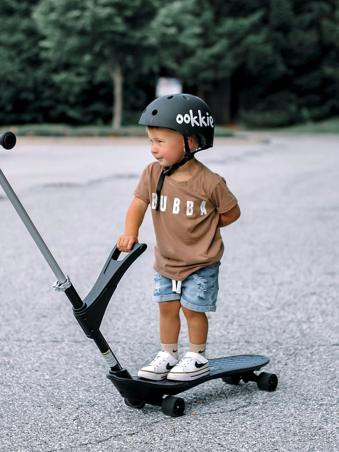 We got the Ookkie for Haydn (2.5yrs old) to learn balance, to bring some fun to our normal walks, so he felt like his siblings on their skateboards. Ookkie is fun for the whole family, each of his older siblings love having their turn to push him on it, it makes our walks more fun and makes him feel so special!